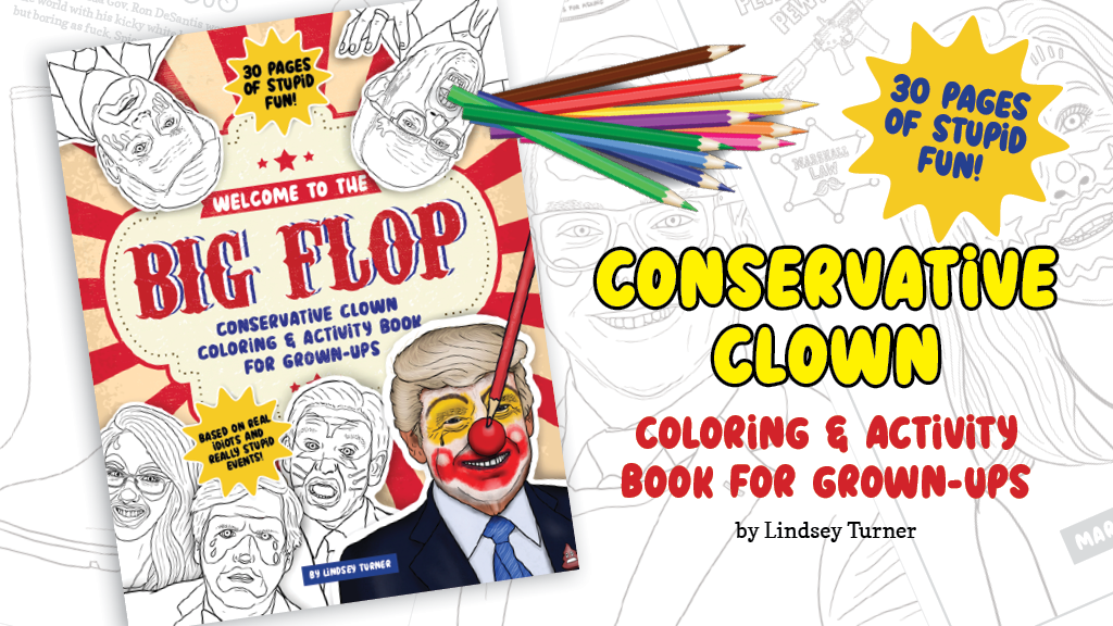 Our Kickstarter is live for Welcome to the Big Flop: The Conservative Clown Coloring & Activity Book! We have 30 days (until Sept. 30, 2024) to raise $1750 and we’d love your support! This book is a hilarious diversion for grown-ups who feel like they've been living through a fever dream these past few years, watching Donald Trump and the Republican Party turn reality into a complete clown show.